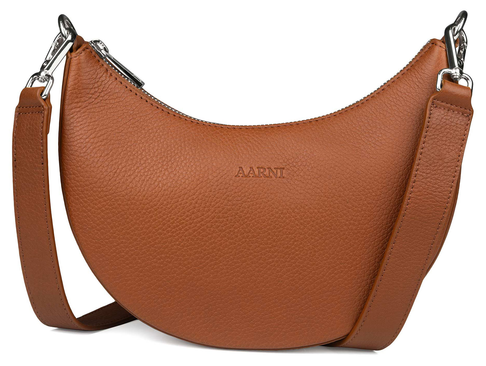 Aarni Luna is a practical and modern everyday shoulder bag with a curved half-moon design that fits elegantly against the body. It includes an open main compartment, a zippered side pocket, and three card slots to keep your belongings organized and secure. The bag is made of strong and flexible Nordic full grain cowhide leather that adapts over time without losing its shape and maintains its natural appearance for years. The leather is dyed and tanned in Alaveteli, Finland.