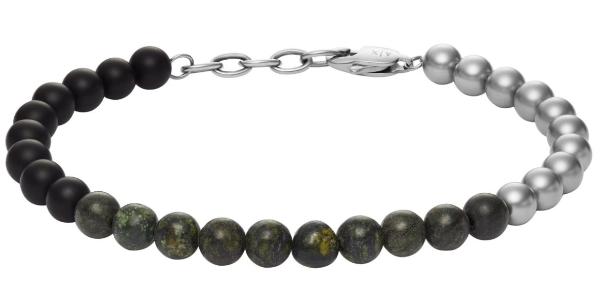 The Armani Exchange Beads bracelet AXG0141040 is adorned with different coloured gemstone and steel beads. The length of the men's bracelet is adjustable between 19.5-22 cm and the width is 6 mm. The Armani Exchange Beads bracelet AXG0141040 comes in the original manufacturer's box.