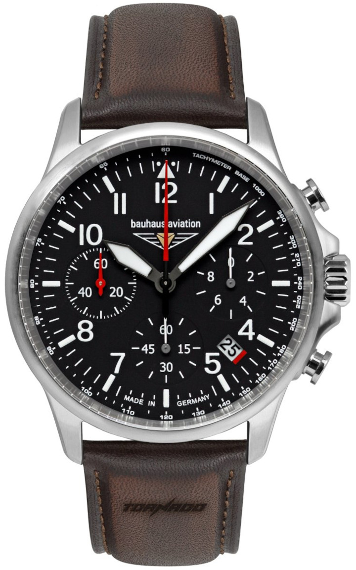 Bauhaus Aviation Tornado 2774-2 is a stylish chronograph watch with large, clear numeral indexes and hands for optimal readability. The minute and hour hands and numeral indexes have a Super-LumiNova coating that glows blue in the dark, making the watch easy to read anywhere. Durable K1 mineral glass protects the blue dial, which also has a date and sub-dials for chronographs. The watch case is made of stainless steel, measuring 42 mm wide and 12 mm thick. The brown leather strap adds a sporty look to the watch; the strap is 22 mm wide and 175 - 220 mm long. The Bauhaus Aviation Tornado 2774-2 is water resistant to 100m / 10atm, which means it is suitable for surface swimming and snorkeling.