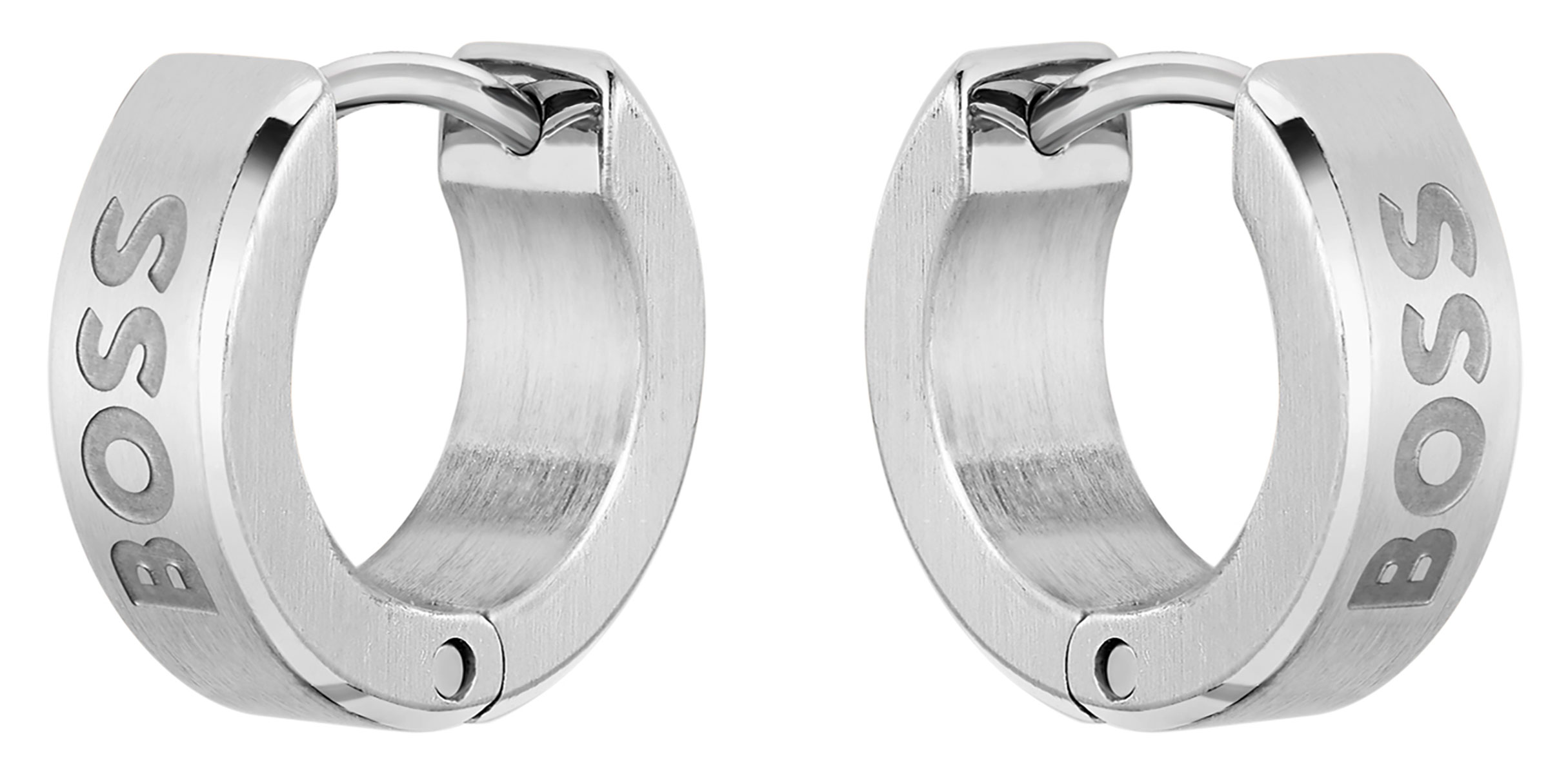 BOSS Odell 1580654 silver coloured hoop earrings are made from stainless steel and feature the BOSS logo. The earrings are 12 mm high, 4 mm wide and have a hinged fastening. The BOSS earrings are delivered in the manufacturer's original packaging.