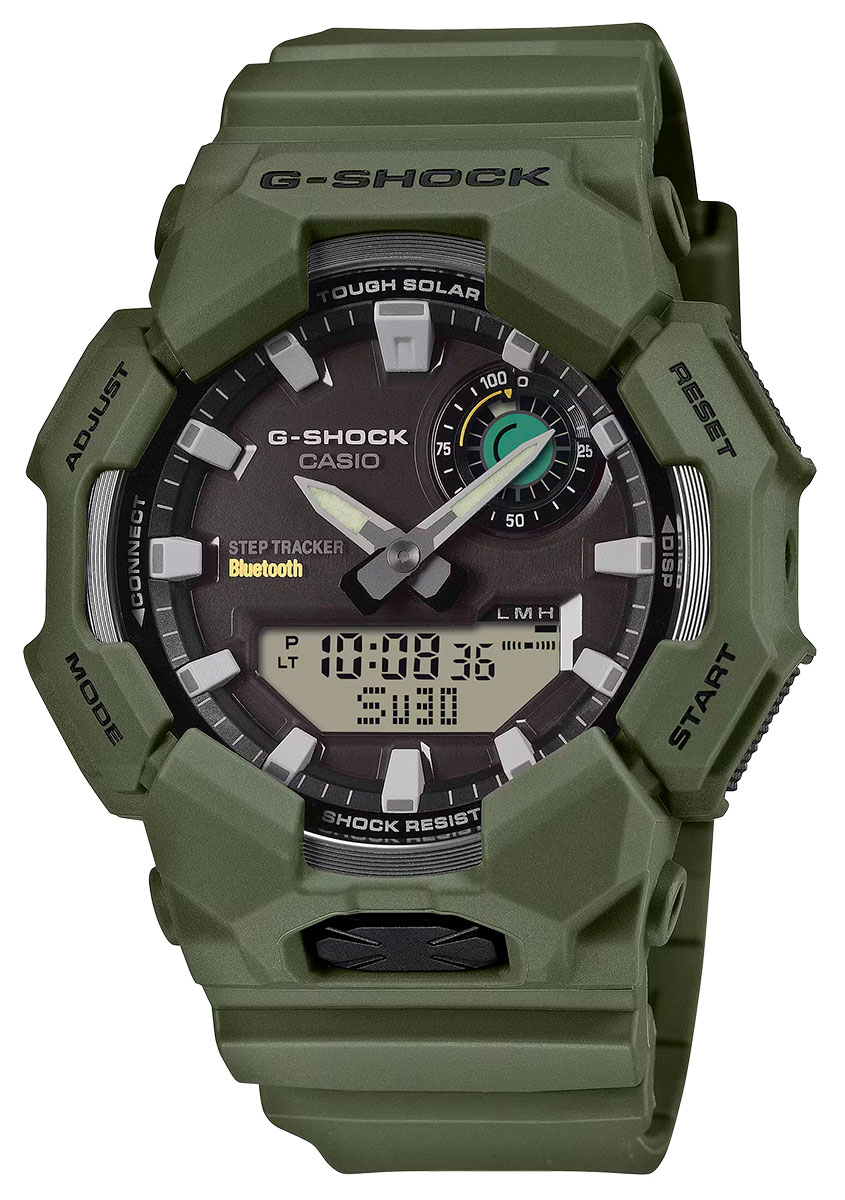 Casio G-Shock GA-B010-3AER combines iconic G-Shock durability with modern technology, including a solar-powered step-tracker and Bluetooth connectivity. Made from bio-based resin, the watch features a matte military green finish and a clear analog-digital display. The model features a large, easy-to-read display and stylish details: a vapor-coated bezel, sunray-finished dial, and metal effects highlight the watch's rugged design.