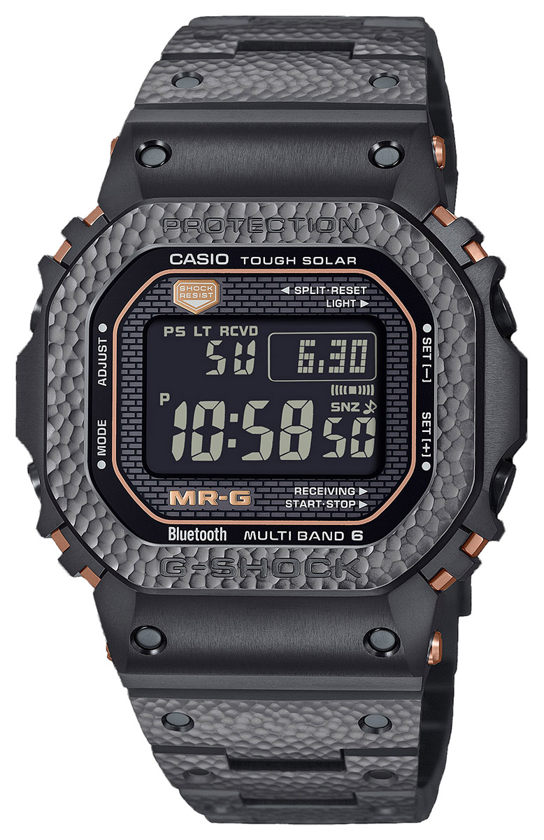 In 1996, the MR-G line revolutionized metal wristwatches, bringing the durability of the G-SHOCK revolution to the luxury class. Now, the MRG-B5000HT takes that legacy even further. Its bezel and strap are meticulously hand-forged using the traditional tsuiki technique by master Kazuya Watanabe, using the “yuragi” technique – controlled irregularity and rhythm that creates a powerful and organic surface. No two watches are exactly alike, so each one is unique.