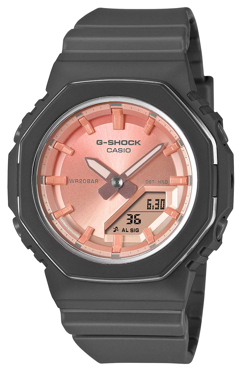Similar in size and comfort to the GMA-P2100, the GMA-P2110 brings a new level of sophistication to the style with its metallic details and minimalist look. The simple bezel without logo or status marking engravings gives the watch a modern and clean impression, and the precisely shaped indexes emphasize its elegant and refined style.
