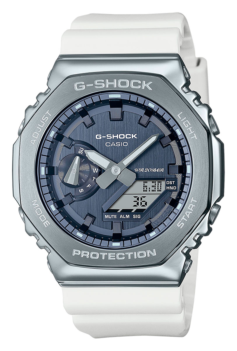 The Casio G-Shock Winter Sparkle GM-2100WS-7AER has a steam-coated watch face inspired by the cold weather of winter holidays, as well as flashy decorations and lights. The watch has a thin and light gray resin body reinforced by carbon fiber with a width of 45.4 mm and a thickness of 11.8 mm. The clock weighs 51 grams. Features include dual LED lights (front and rear lights), world time, alarm, timing, output timer, automatic calendar and 12/24 hour display. The waterproof is 200 m, which means it is suitable for diving. The rear corner of the watch is engraved with the original Seasonal Pair Collection cord pattern, symbolizing the bonds of love.