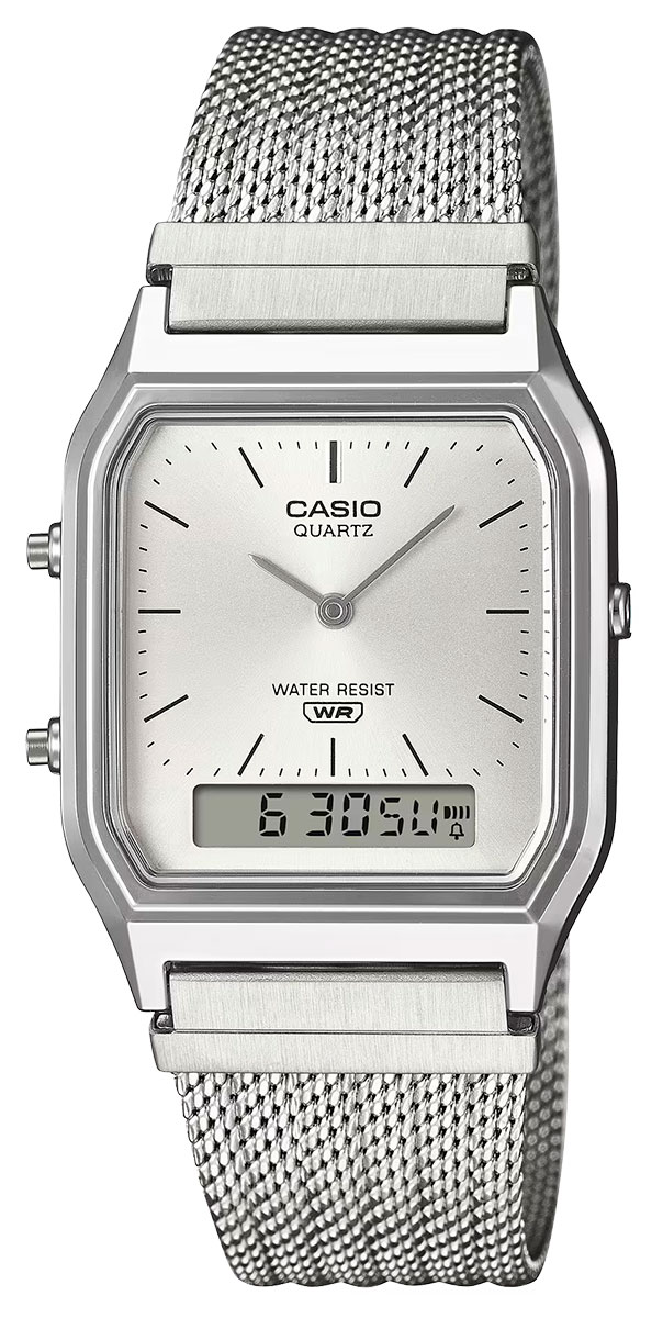 Casio brings its iconic analog-digital combination to a new era: the angular AQ-230 gets a sleek and elegant look thanks to a finely woven mesh strap. The steel strap, finished with a special pressing method, creates depth and texture, giving the watch a sophisticated vintage look and excellent wearing comfort.