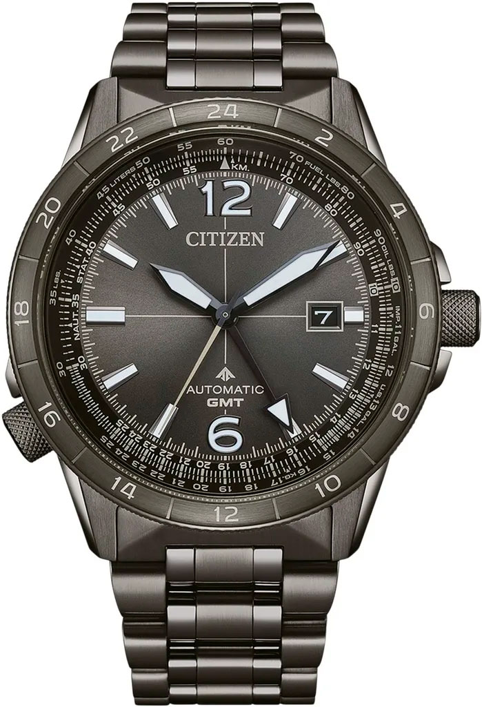 Citizen Promaster SKY Automatic NB6045-51H is the first GMT watch in the Citizen SKY series. Inspired by advanced aviation technology, this automatic pilot's watch is packed with innovative details. The watch's case and bracelet are made of black stainless steel, and the improved magnetic resistance (16000 A/M) prevents digital devices from negatively affecting the accuracy of the watch at a distance of more than 1 cm. The black dial is topped with an anti-reflective sapphire glass. The dial features a date, large luminous hands and indices, and a GMT hand that allows you to set the watch to another time zone. A lide rule bezel surrounds the dial. The automatic pilot watch has a 50-hour power reserve, and to -10 / +20 seconds per day accuracy. The case measures 44.5 mm in width and 12.67 mm in thickness, the bracelet is 22 mm wide at the attachment point and the total weight of the watch is 100 grams. Thanks to the screw-in crown, the watch has excellent water resistance; 200m / 20atm, making it suitable for swimming and scuba diving.