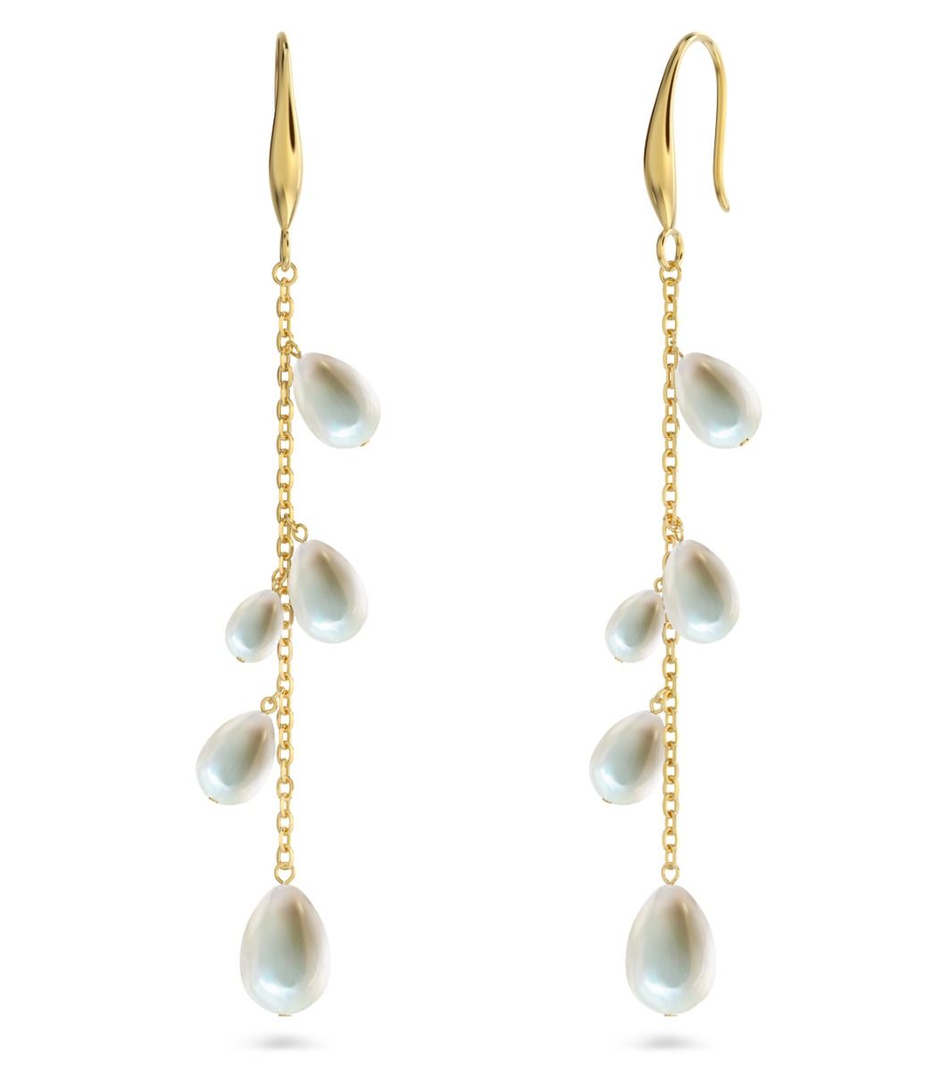 Long gold-coloured Edblad Angeleno pearl earrings 126843 are adorned with multiple mother-of-pearl pearls on a beautiful gold plated steel chain. The long shoulder duster pearl earrings measure 90 mm, with pearls measuring 9.5 x 6, 11.3 x 8, 15.3 x 10.3 mm. The long earrings are finished in 14-karat gold.