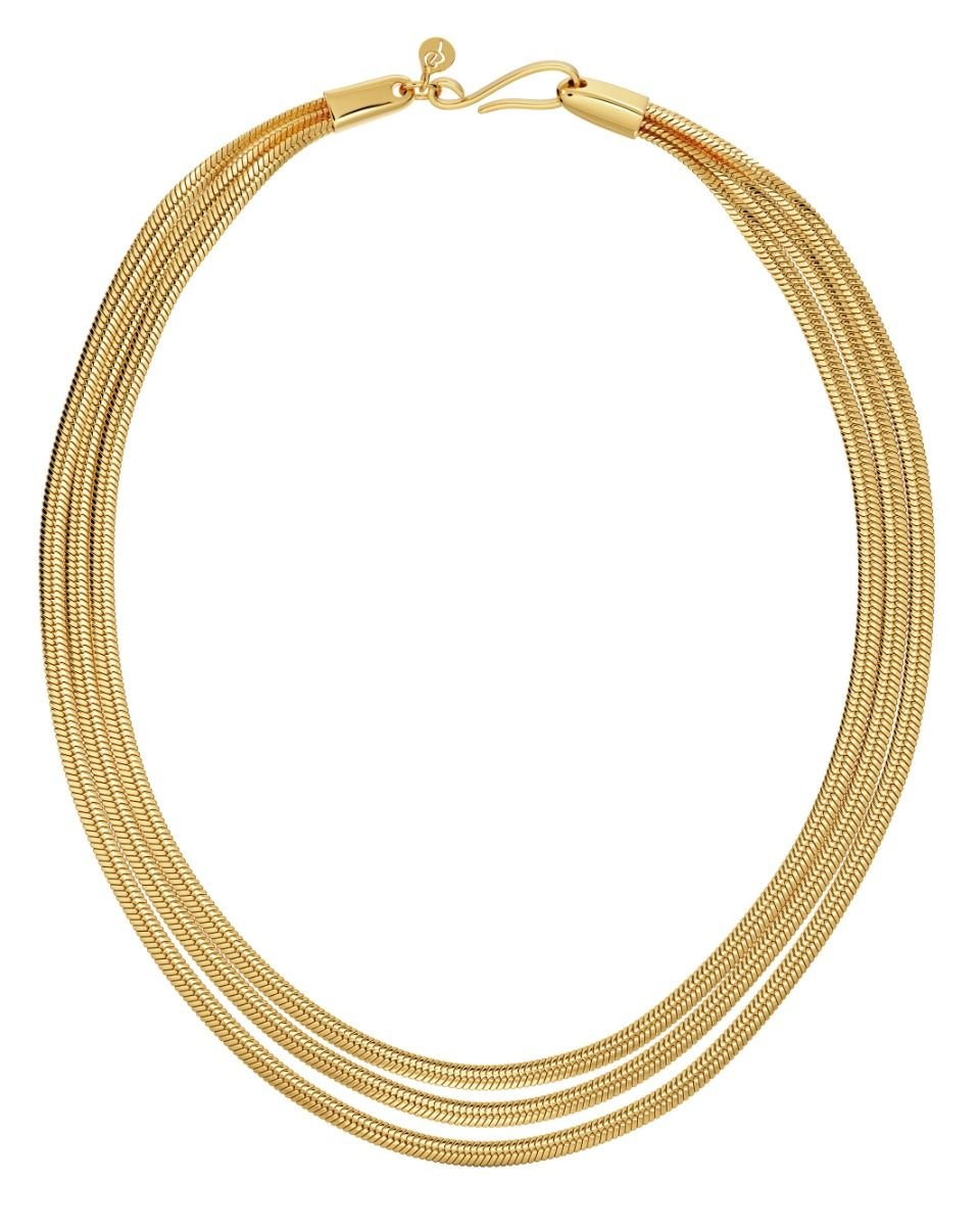 Edblad Herringbone Triple Gold 127429 necklace features three thick herringbone chains, creating a striking detail to your outfit. The necklace is made of 14-karat gold-plated stainless steel and features a s-chain for easy dressing. The necklace is 43 cm long and 3.5 mm thick.