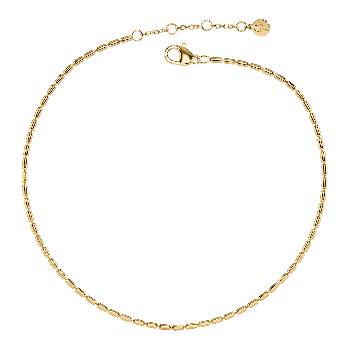 Edblad Seed 130328 anklet is a delicate and elegant piece of jewelry that will finish off your summer style in a subtle way. Its layered chain is made of shiny stainless steel with 14 karat gold plating, consisting of separate small rectangular pieces. The anklet is adjustable in length to 24, 25, 26 or 27 cm. Nickel-safe and water-resistant.