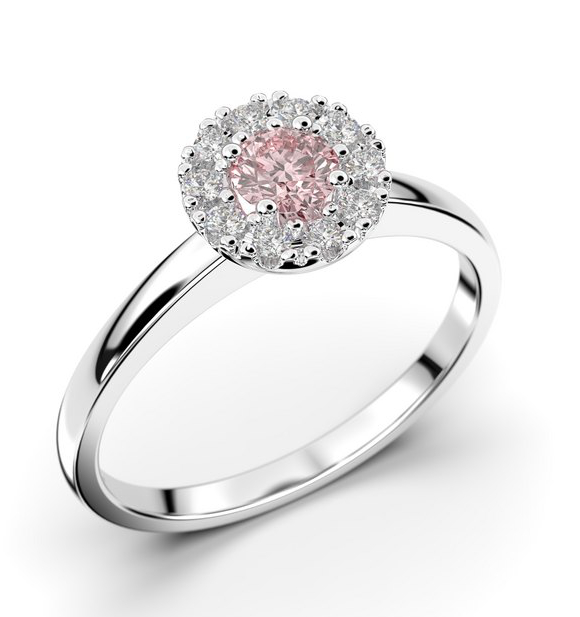 The Festive Annabella 598-028M-VK halo morganite diamond ring is a timeless and unique choice. The ring features a smooth flawless shank and a delicate floral halo setting with a 0.18 karat pink morganite center. The larger stone is further bordered by 10 pieces of 0.01 carat brilliant-cut diamonds, and the floral look is completed with rounded, metal claws on the edges. The shank of the ring is 1.9 mm thick and the diameter at the stone setting is 7.3 mm.