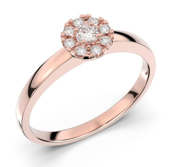 The Festive Bella 606-015-PK halo diamond ring features a smooth, modern, square frame and a timeless diamond halo setting. The floral setting is adorned with a larger 0.07 carat center diamond and 8 pieces of 0.01 carat rim diamonds. The width of the ring is 1.9 mm, and 5.9 mm at the diamond setting. The edges of the shank are rounded for a comfortable fit.