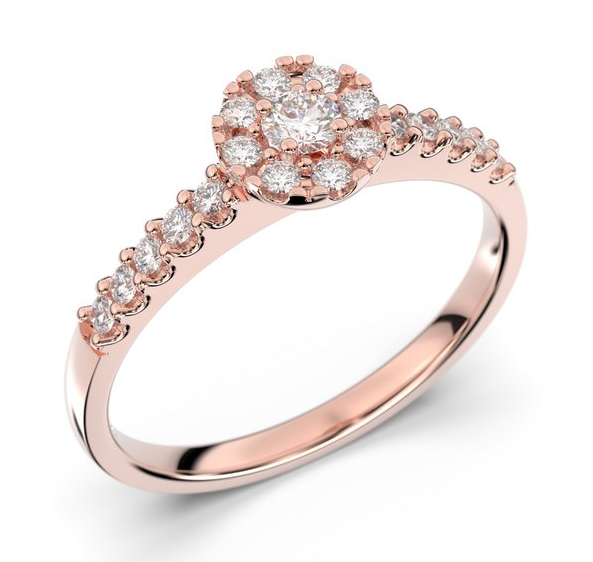 The Festive Bella 606-025-PK halo diamond ring features a modern setting and a multi-diamond halo setting. The floral halo setting is adorned with a larger 0.07 carat center diamond and 8 pieces of 0.01 carat rim diamonds. In addition, the body of the ring is decorated with ten diamonds which completes the luxurious look of the ring. The width of the ring is 1.9 mm, with a 5.9 mm width at the diamond setting. The edges of the frame are rounded for a comfortable fit.