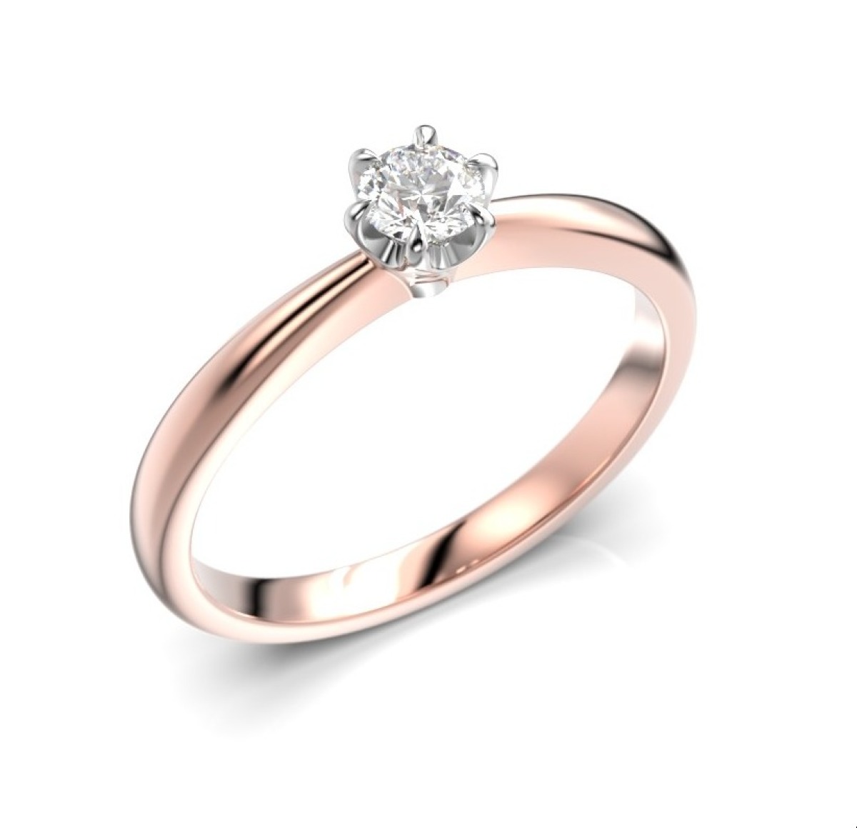 A solitaire diamond ring is one of the most classic and most sought after wedding and engagement ring types. Festive Classic 23 diamond ring 0,20 ct with prong setting rose and white gold 686-020-PV is made of 14 karat or 18 karat rose gold depending on your preferences, and is adorned with a 0,20 ct diamond. The prongs are made of white gold enhancing the clear look of the diamond. The shank tapers towards the stone finalizing the classic look of this solitaire ring.
