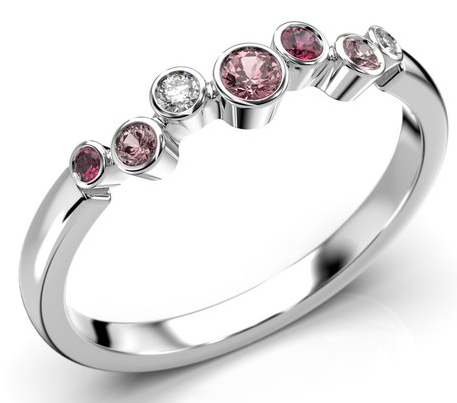 The Finnish-made Festive Drop Pink diamond colored stone ring 644-015P-VK glows with gemstones like drops. Set into a 2 mm wide frame are several diamonds of different sizes (0.02 + 0.01 ct), pink sapphires (0.05 + 2 x 0.02 ct), and rubies (0.02 + 0.01 ct). Wear alone or with a matching row ring.