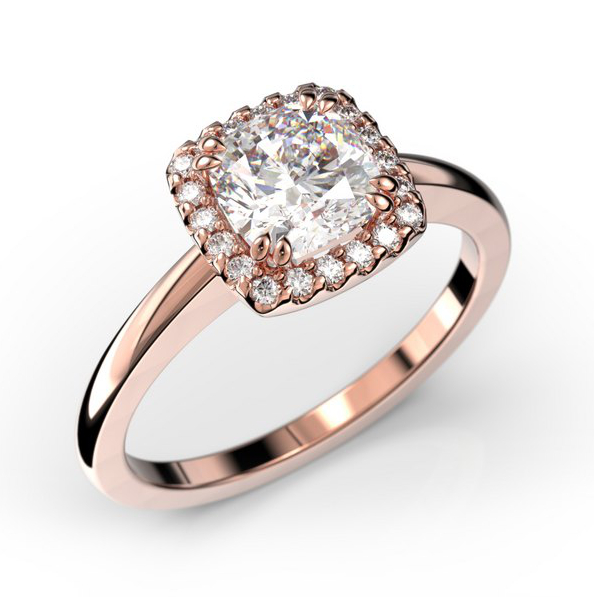The Festive Elsa 587-090-PK diamond ring features a classic halo setting, adorned with a large cushion-cut 1.00 carat clear diamond and 20 smaller 0.005 carat diamonds. Teardrop-shaped double claws, that hold the diamond in place, give this wring an unique look. The body is comfortable on the finger, with a 1.9 mm width on the shank and a width of 8.3 mm at the setting.