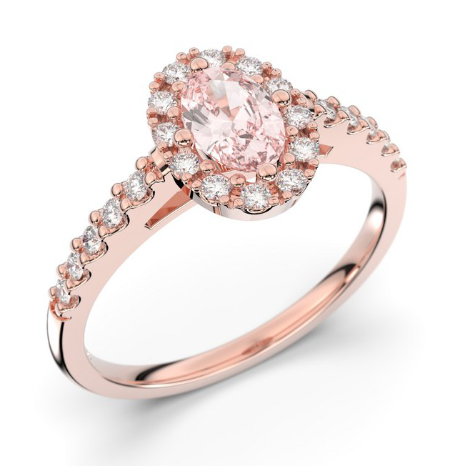Festive Evelyn 577-072M-PK is a stunningly beautiful halo morganite diamond ring with an oval-shaped brilliant-cut 0.50-carat pink morganite in the center, sparkling beautifully against the rose gold of the frame. The morganite is framed by 10 0.01-carat clear diamonds, and the setting continues on the ring's body to complete this classic ensemble. The shank is 1.5 mm thick, and the delicate d-shape-body design sits comfortably on the finger. The width at the setting is 9 mm. The ring can be worn alone or combined with another ring to create the perfect ensemble.