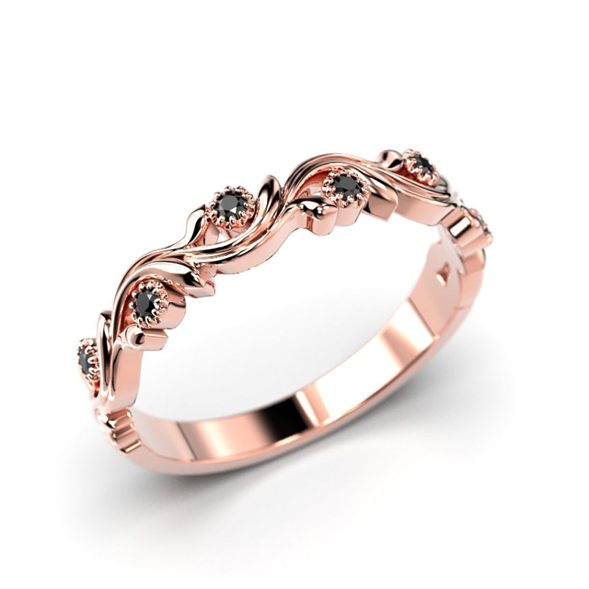 The Festive Feeniks Siro Black diamond ring with stunning black diamonds is made from 14-karat red gold. The ring features six sparkling brilliant-cut black natural diamonds set in a vine-patterned band. Black diamond is an enchanting natural stone whose deep dark hue is combined with a unique luster and the unparalleled durability of diamond. The Feeniks Siro Black ring is also available in white and yellow gold. The total weight of the diamonds is 0.06 carats, the color is black, and the clarity grade is VS1. Festive jewelry is designed in Finland and made from 100% recycled gold.