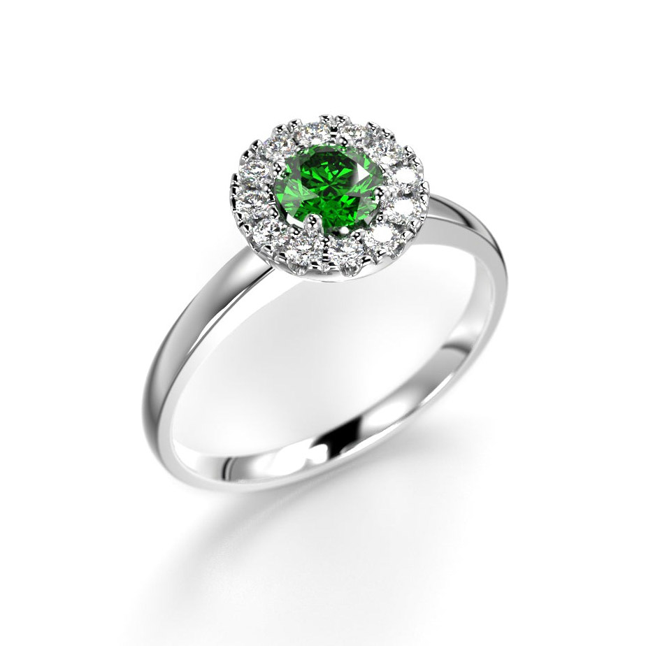 The elegant and modern Festive Isabella Green halo ring features a stunning green tsavorite surrounded by a frame of sparkling diamonds. The ring is available in 14 or 18 karat white gold, which enhances the deep glow of the green gemstone and the brilliance of the diamonds.
