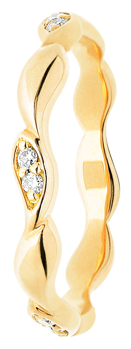 The Ivy ring from Festive is a uniquely designed diamond ring. The wavy design of the ring creates a ropey effect that serves as a fun detail to an otherwise simple piece of jewellery. The jewellery is adorned with ten clear 0.01ct Wesselton diamonds, cut with a brilliant-cut diamond to maximise brilliance. You can choose either a 14 karat or 18 karat yellow gold ring (a white gold version of the same piece is also available). The diamond ring is part of the popular vintage collection and measures 2.5mm in width.