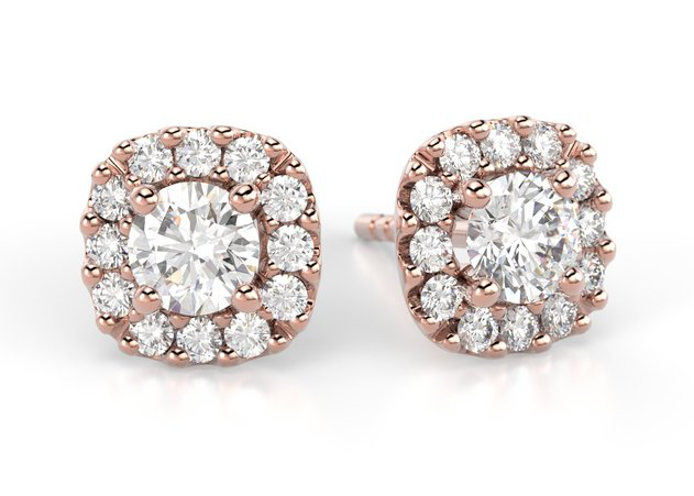 The classic Festive Janette 567-060K-PK diamond earrings feature a romantic reddish rose gold glow in combination with bright brilliant cut wesselton diamonds. A 0.18 carat diamond adorns the center of the ring, surrounded by 12 clear 0.01 carat diamonds to create a beautiful floral design. These timeless halo earrings measure 7 mm in height and feature a pin clasp at the back.