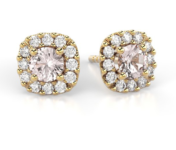The classic Festive Janette 567-060MK-KK morganite diamond earrings feature a beautiful yellow gold glow with pink morganite and bright brilliant cut wesselton diamonds. A 0.18 carat morganite adorns the center of the ring, giving it a unique pink glow, and the stone is surrounded by 12 clear 0.01 carat diamonds. These timeless halo earrings are 7 mm high and feature a pin clasp on the back.