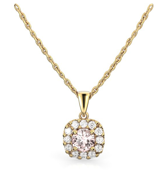 The classic Festive Janette 567-030MR-KK morganite diamond pendant features a beautiful yellow gold sparkle with a pink 0.20 carat morganite and 12 clear 0.01 carat wesselton diamonds. This pendant features a timeless halo setting technique that looks elegant year after year and is perfect for special occasions and as a gift. The height of the pendant is 12 mm.