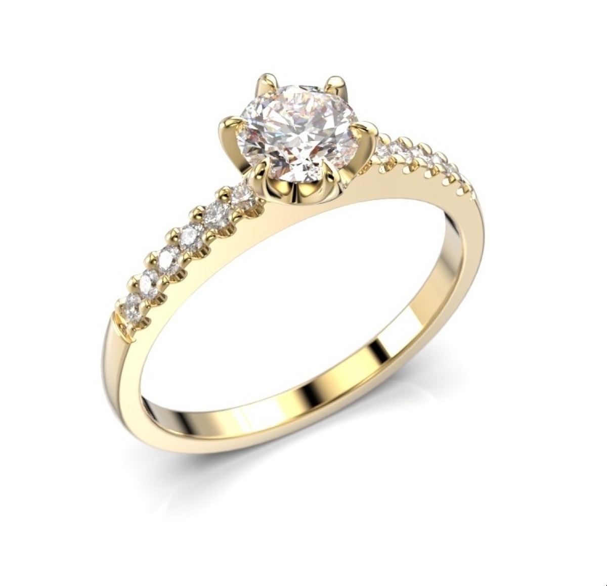 Festive Julianna crown diamond side-stone ring 0,62 ct yellow gold 682-062-KK is adorned with 12 0,01 ct diamonds and one 0,50 ct center stone in a beautiful prong setting. The shank is made of yellow gold.