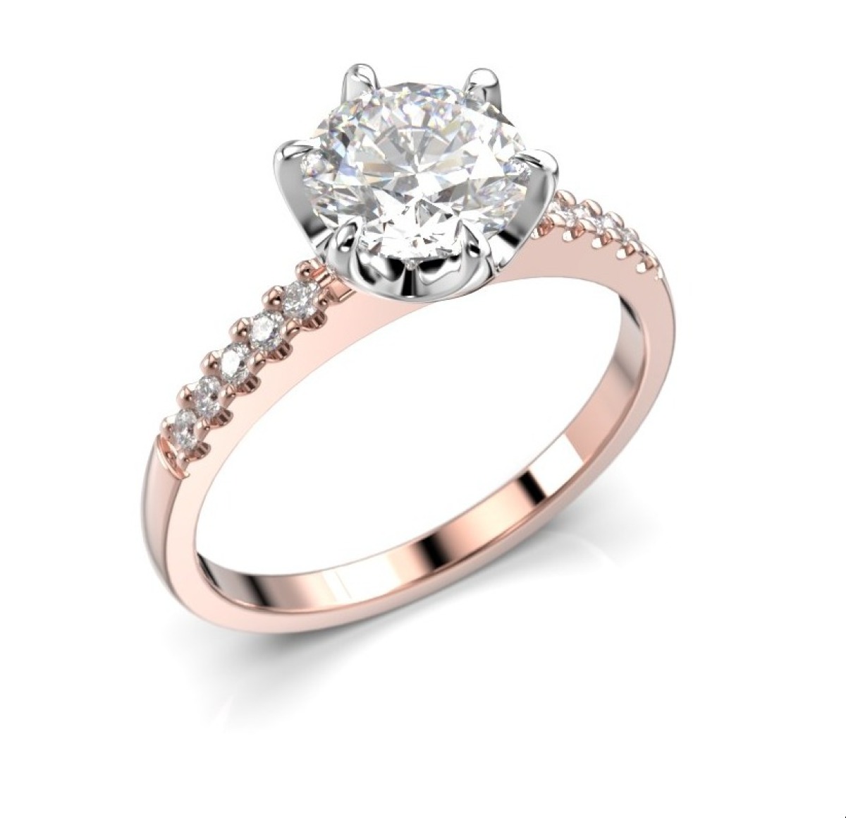 Festive Julianna side-stone diamond ring 1,10 ct crown rose and white gold 682-110-PV is adorned with 10 0,01 ct diamonds and one 1,00 ct center stone in a beautiful prong setting. The shank is made of rose gold, and the white prongs in white gold add a tough of modern lux.