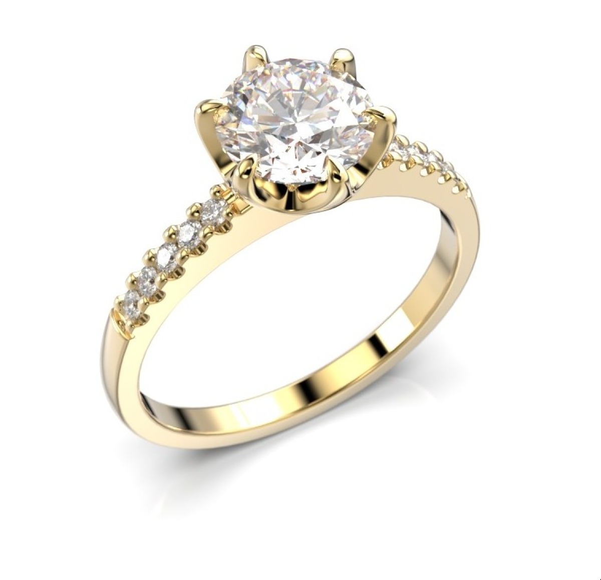 Festive Julianna side-stone diamond ring 1,10 ct crown yellow gold 1,10 ct 682-110-KK is adorned with 10 0,01 ct diamonds and one 1,00 ct center stone in a beautiful prong setting. The shank is made of yellow gold.