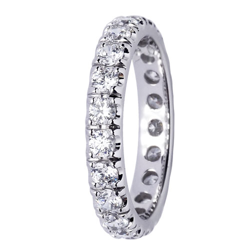 Kimberly is a beautiful understated diamond eternity ring from Festive. The surface of the ring is adorned with a full circumference diamond row set with 21 clear Wesselton diamonds. The diamonds are 0.07ct in size and weigh 1.47g. The diamonds are brilliant-cut to maximise the brilliance of the diamonds. The frame is 3.5mm wide and is made of high quality white gold with a choice of 14 or 18 karats. The same ring is also available in yellow gold.