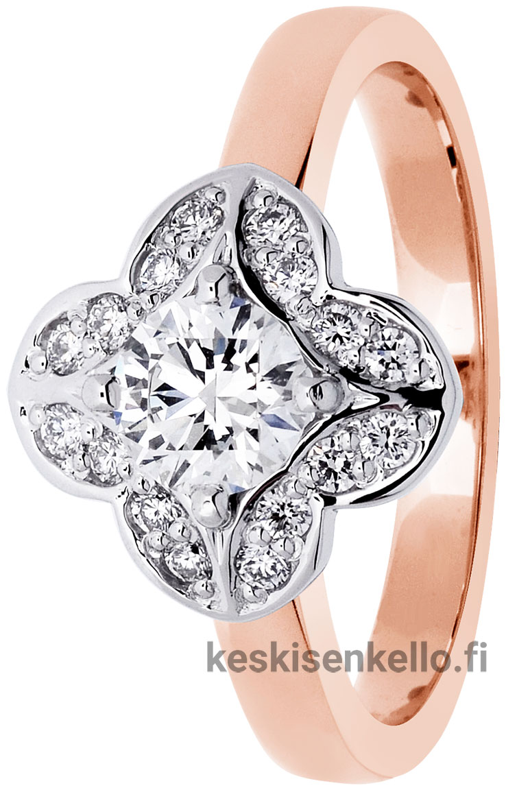 The Magnolia ring is part of Festive's popular vintage collection. Designed by Marko Osala, the halo ring is adorned with a beautiful flower-shaped setting of 17 clear Wesselton diamonds. The diamonds measure 16x0.01ct and 1x0.45ct and are cut using a traditional diamond cut to maximise the sparkle of the stones. The rose gold used in the jewellery is available in either 14 karat or 18 karat (there are also red and yellow gold versions of the same ring). The width of the ring is 2.5mm at the shank and 11.5mm at the stones.