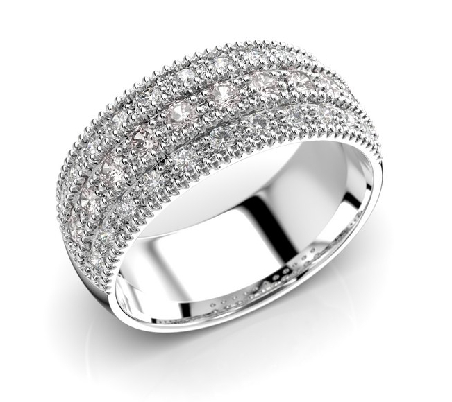Festive Manuela 579-052M-VK is an impressive multi-row morganite diamond ring. This 7.7 mm in width ring is adorned with 10 0.03 carat pink morganite and 22 0.01 carat brilliant-cut diamonds, giving the ring a luxurious look. A romantic lace edge completes the look, while the semi-circular cut body is comfortable on the finger.