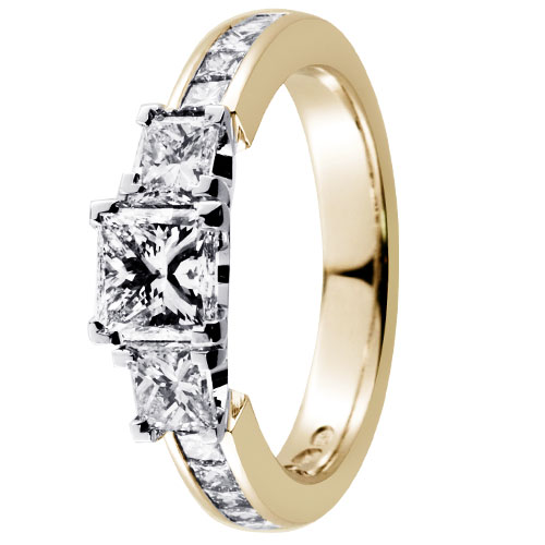 The Marilyn ring is a luxurious wedding ring that offers the brilliance of large diamonds. The trilogy ring is part of Festive's Luxury collection. The body of the ring is 5mm wide and is crafted using both white and yellow gold. You can choose between 14 or 18 gold karats. An all-white gold version of the same piece is also available. Eleven angular princess-cut diamonds are set into the surface of the sparkling ring. The diamonds are clear Wesselton diamonds of high purity SI grade. The largest of the diamonds appears to be 1ct. The largest diamond is flanked by two 0.3ct diamonds and eight 0.05ct diamonds. The total weight of the gemstones used in the jewellery is 2g.