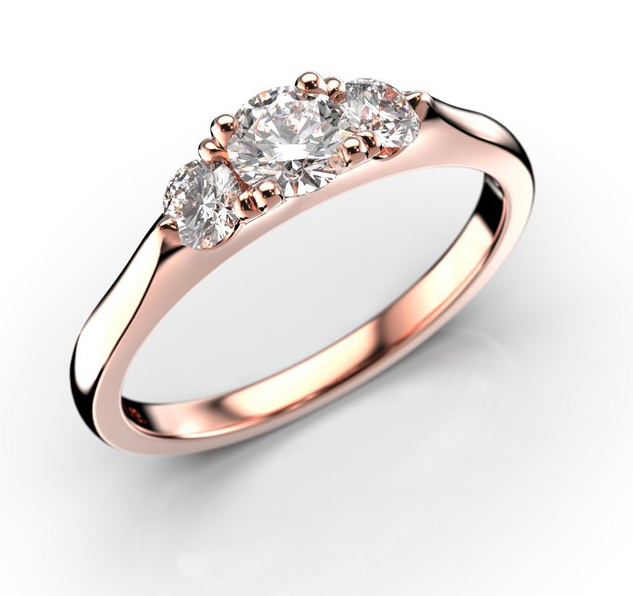 Festive Megan 572-050-PK is a classically beautiful diamond ring with a slim, comfortable frame and a beautiful setting of three brilliant-cut diamonds. The trilogy ring measures 1.9 mm in width, with a carat count of 0.28 for the center diamond and 0.11 for the clear side diamonds.