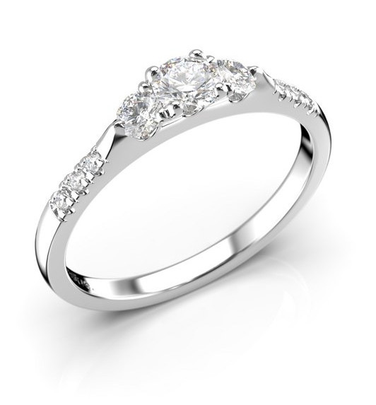 The Festive Melissa 574-039-VK diamond ring has a 1920s feel and a multi-diamond setting. The central part is adorned with a spectacular raised setting of three brilliant-cut stones, which continues on the ring's body in the form of smaller diamonds. The ring is 1.5 mm in width and the semi-circular design sits smoothly on the finger. The center diamonds are 1 x 0.20 ct + 2 x 0.07 ct, and the six side diamonds are 0.009 ct.