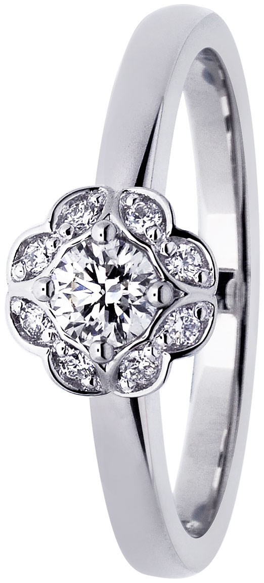 The Mimosa ring is part of the Vintage collection of the prestigious Finnish jewellery brand Festive. The ring was designed by Marko Osala. The ring is made of high quality silver-toned white gold, with a choice of 14k or 18k karats (there are also yellow and rose gold versions of the same ring). The multi-stone halo ring is adorned with 9 clear Wesselton diamonds measuring 1x0.22ct + 8x0.01ct. The diamonds are cut with a classic brilliant cut and meet the SI grade on the purity scale. The width of the ring is 2.2mm at the shank and 7.3mm at the diamonds.