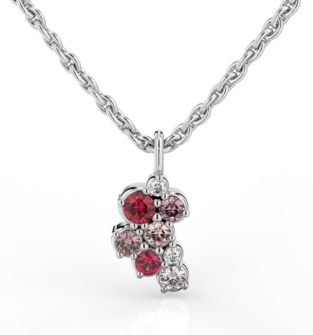 Festive Nelly Pink 630-022P-VK is a beautiful pink-toned diamond pendant set with diamonds (2 x 0.01 ct), tourmalines (2 x 0.03 ct), pink sapphires (2 x 0.03 ct) and rubies (0.05 + 0.03 ct). The stones are beautifully grouped in a slightly uneven row on a 13 mm long body in a way that makes the stones cluster together and create a very unique ensemble. Combine with the Nelly earrings to create a unique ensemble. The chain is sold separately.