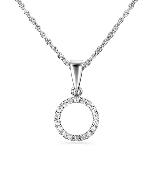 The Festive Saturnus 620-009R-VK diamond pendant takes the wearer to space and the rings of Saturn. The pendant's 18 clear 0.005 carat Wesselton diamonds shine like stars in space. The pendant measures 14 x 8.5 mm.