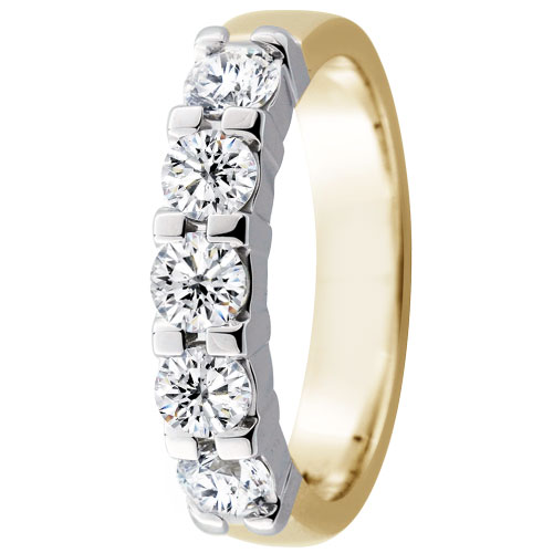 The luxurious Sophia ring, from the high quality Luxury collection of Festive, a Finnish jewellery brand. The surface of the ring is adorned with five clear Wesselton diamonds, which are of the highest purity class SI. The diamonds on the ring are all brilliant-cut, allowing them to shine spectacularly as they reflect light. The diamonds in the ring measure 0.2ct and weigh a total of 1g. The ring measures 5mm in width, and both white and yellow gold are used in the setting. The gold karats are 14 or 18, depending on your preference. An all white gold version of the same ring is also available.