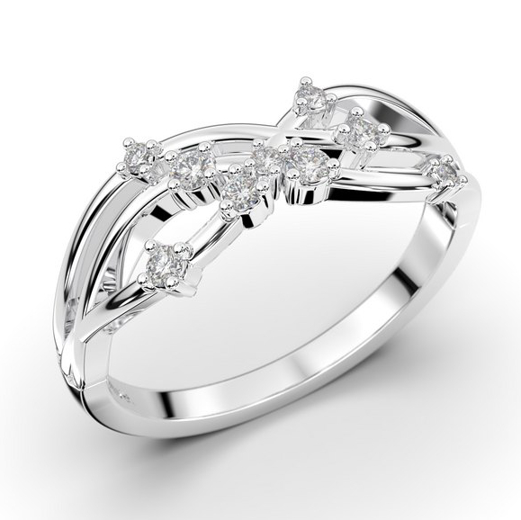 The Festive Stella 602-012-VK diamond crossover ring features a design inspired by the northern stars and northern lights. The setting of the ring is adorned with 9 diamonds, each with a carat count of 0.12. The width of the shank is 1.6 mm, while the width of the setting is 6 mm.