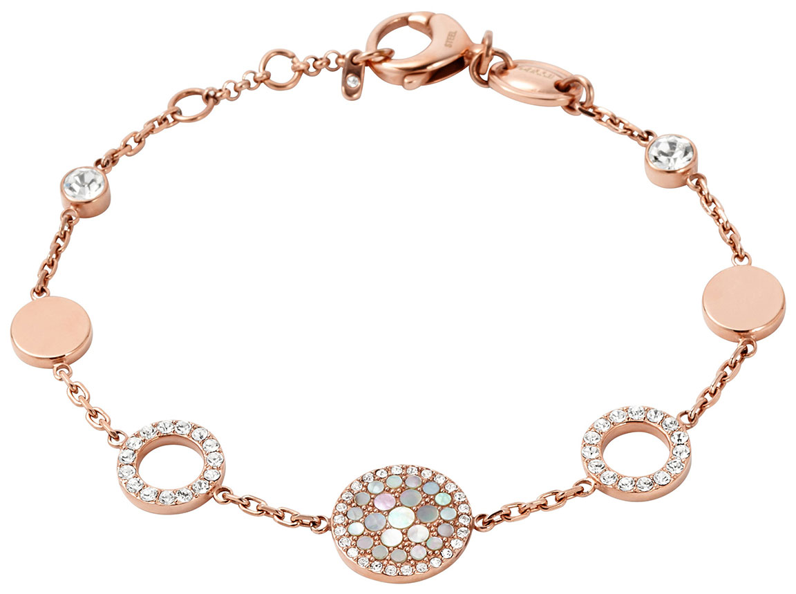 The Fossil Pearl Disk Station JF01739791 bracelet is made of rose gold coloured stainless steel. The bracelet features round pendants adorned with sparkling cubic zirconia and mother-of-pearl. The length of the bracelet is 17,8 + 2,5 cm. The bracelet is fastened with an easy-to-use lobster clasp. Fossil jewellery is delivered in the original manufacturer's box.
