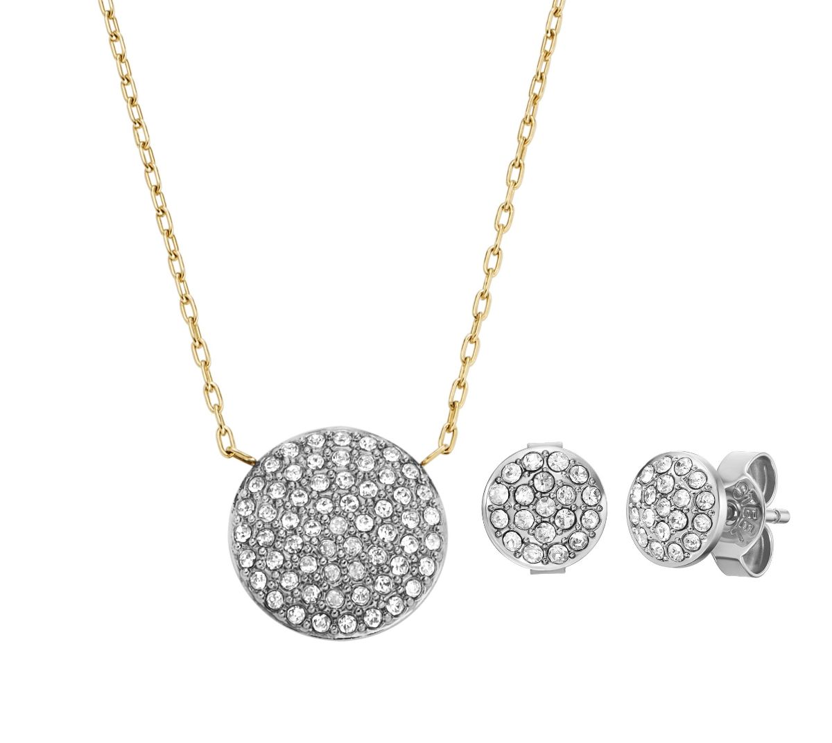 Fossil Glitz Disc jewellery set JF04815SET includes a lovely pendant adorned with dozens of crystals and matching earrings measuring 12.3 mm. Both the earrings and the necklace are made of stainless steel. Thanks to the beautiful crystals, this jewellery set will add sparkle to any outfit, and is sure to be a pleasing gift for any woman. The length of the necklace is adjustable between 40.6-45.6 cm. The Fossil Glitz Disc Jewellery Set JF04815SET comes in a beautiful gift box.