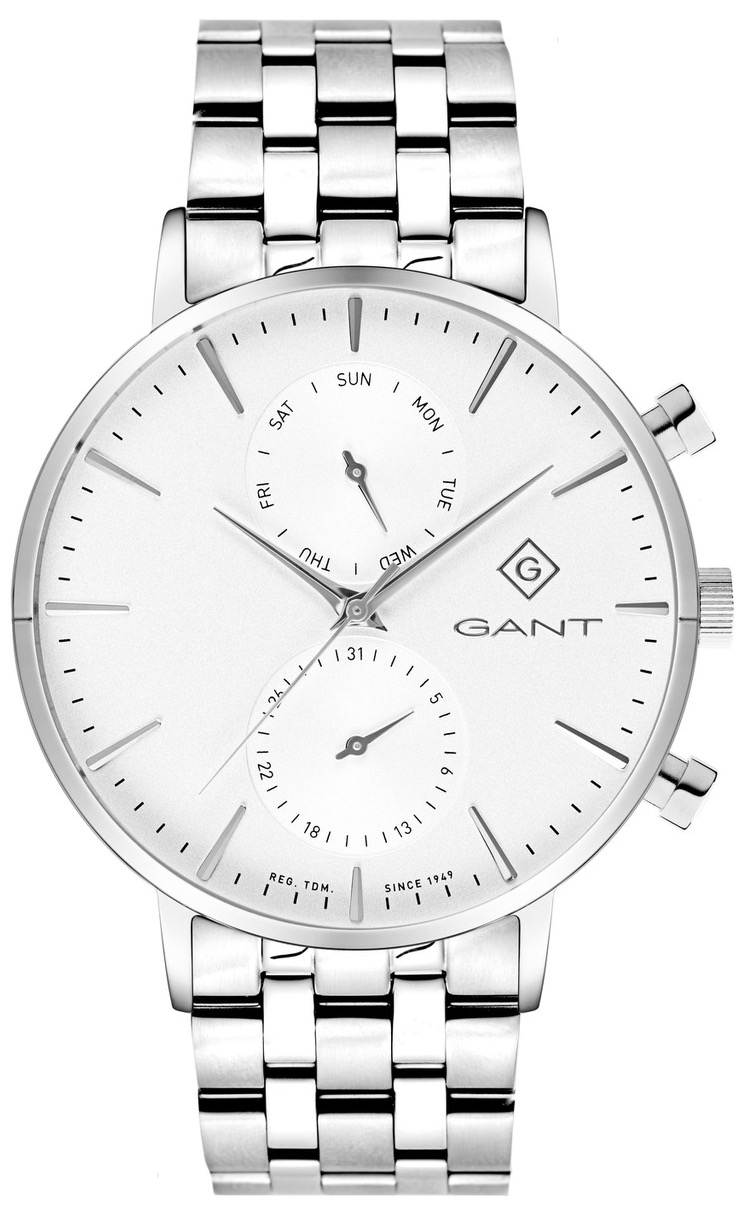 The Gant Park Hill Day-Date is an elegant stainless steel classic men's watch that won't lose its style over time. The versatile watch features a day of the week and date display in addition to the traditional clock display. The Gant Park Hill Day-Date II White G121002 features a white dial and a steel bracelet with a sturdy link buckle. The case measures 43.5 mm wide and 11.6 mm thick, and is protected by a slightly convex glass. The steel bracelet is 22 mm wide. Gant watches are guaranteed for two years and come in the original manufacturer's box.
