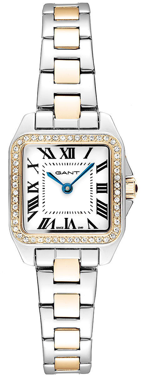 The Gant Seneca Bijou G193102 women's wristwatch features a sophisticated square-shaped case and a white mineral glass-protected dial with black Roman indexes and blue minute and hour hands. The frame is 22.5 mm wide and only 6 mm thick. The watch has a Miyota GL22 quartz movement and the watch frame is decorated with clear zirconias. The width of the two-tone steel bracelet from the attachment point is only 12 mm, which makes the watch very comfortable to wear on the wrist. Gant Seneca Bijou G193102 belongs to the waterproof class 30 m / 3 atm, i.e. it is splash-proof.