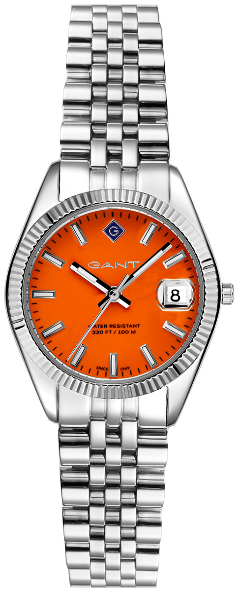 The brightly coloured dial of the Gant Sussex Mini Red G181008 women's wristwatch is accented by a silver-coloured case and steel bracelet. The red dial features a date dial and luminescent hands and indexes. The body measures 28 mm wide and 8 mm thick. The bracelet is 150 - 210 mm long and 14 mm wide at the attachment point. The watch is water-resistant up to 100 metres. Gant watches come with a two-year warranty and are supplied in the original manufacturer's box.
