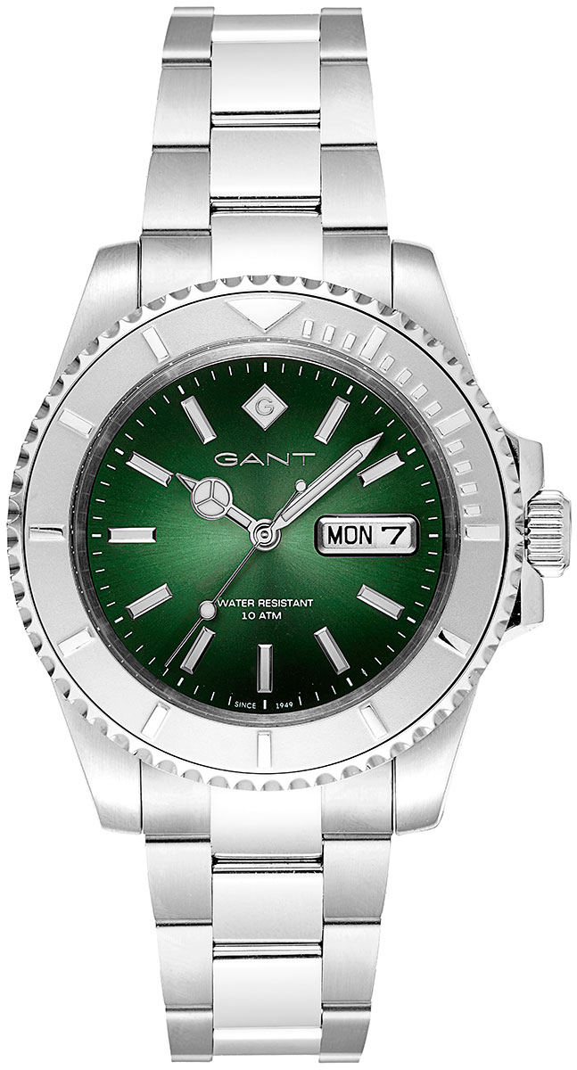 Gant Watertown G204003 is an attractive men's wristwatch with a gray steel case and a Miyota 2305 quartz movement. The watch has a diameter of 41 mm and a thickness of 10 mm. Durable mineral glass protects the green dial, which has a date and day of the week display at 3 o'clock, and luminescent hands and indices help you see the dial in low light. The width of the steel bracelet from the attachment point is 20 mm. Gant Watertown G204003 belongs to the waterproof class 100m / 10atm, which means it is suitable for surface swimming and snorkelling.