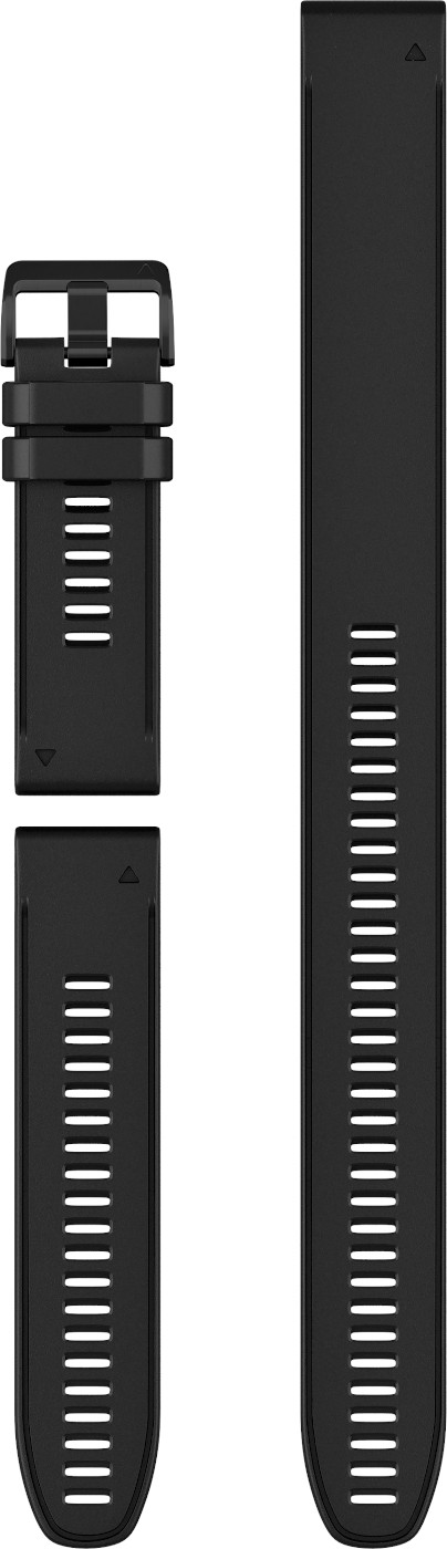 Garmin Quickfit 26 mm black silicone wrist strap 010-12907-00. The bracelet has a black silicone part and a black buckle. Thanks to the new QuickFit technology, no attachment tools are needed. With QuickFit bracelets, you can change the look and feel of your watch with just one click. It's easy to change the strap, but the attachment is always secure. There's a bracelet for every sport and occasion.