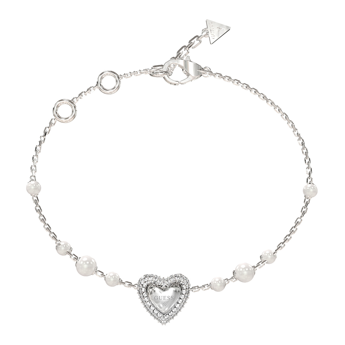 GUESS Beloved JUBB06009JWRHS bracelet is made of shiny stainless steel, with a chain set with light pearls and a large, warm-hearted heart charm. The edges of the heart charm are filled with clear crystals, which give the jewelry extra sparkle and glamour. The bracelet has an easy-to-open and close parrot clasp. Chain length 14.6 - 18.4 cm.