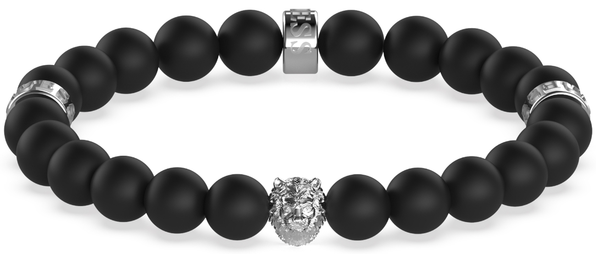 The silver-tone Guess Hero Lion head JUMB01303JWSTT/U bracelet is made of black lava stones and adorned with a lion's paw pendant. The pendant measures 1.2 cm and the chain length is 20.5 cm. The Guess jewellery comes in the original manufacturer's box.
