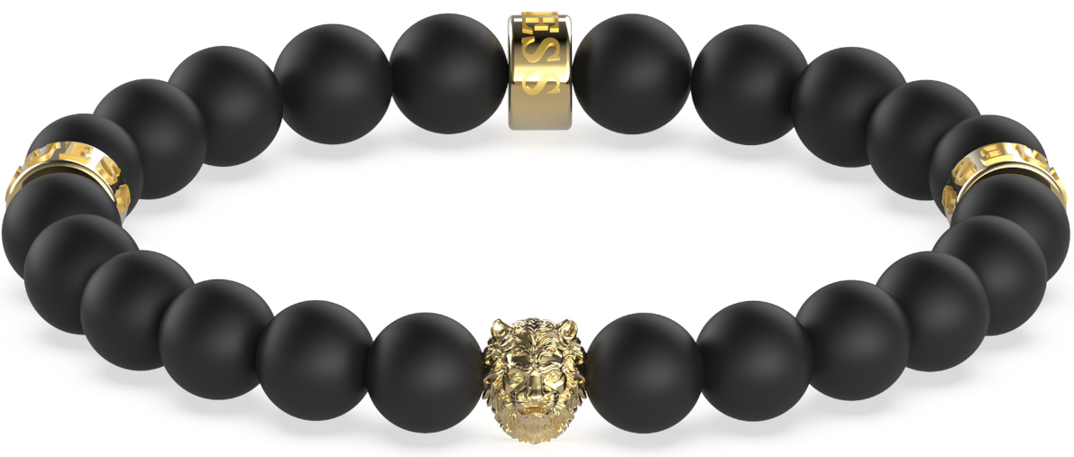 The gold-tone Guess Hero Lion head JUMB01303JWYGT/U bracelet is made of black lava stones and is adorned with a lion's paw pendant. The pendant measures 1.2 cm and the chain length is 20.5 cm. The Guess jewellery comes in the original manufacturer's box.